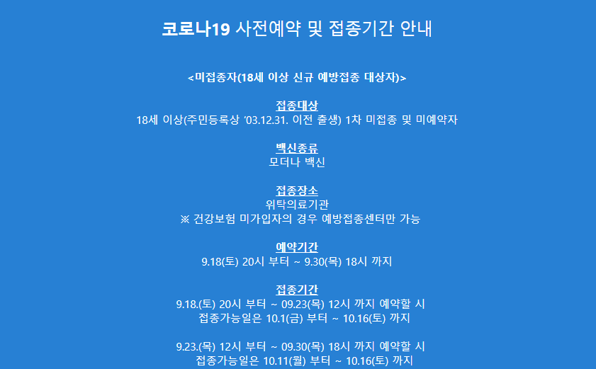 코로나19 사전예약 및 접종기간 안내<미접종자(18세 이상 신규 예방접종 대상자)> 접종대상 18세 이상(주민등록상 ‘03.12.31. 이전 출생) 1차 미접종 및 미예약자 백신종류 모더나 백신 접종장소 위탁의료기관 ※ 건강보험 미가입자의 경우 예방접종센터만 가능 예약기간 9.18(토) 20시 부터 ~ 9.30(목) 18시 까지 접종기간 9.18.(토) 20시 부터 ~ 09.23(목) 12시 까지 예약할 시 접종가능일은 10.1(금) 부터 ~ 10.16(토) 까지 9.23.(목) 12시 부터 ~ 09.30(목) 18시 까지 예약할 시 접종가능일은 10.11(월) 부터 ~ 10.16(토) 까지 |