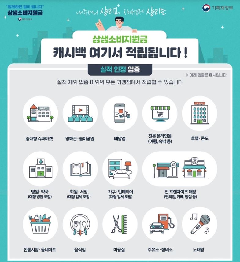 중대형 슈퍼마켓, 영화관·놀이공원, 배달앱, 전문 온라인몰(여행, 숙박 등), 호텔·콘도, 병원·약국(대형 병원 포함), 학원·서점(대형 업체 포함), 가구·인테리어(대형 업체 포함), 전 프랜차이즈 매장(편의점, 카페, 빵집 등) 전통시장·동네마트, 음식점, 미용실, 주유소·정비소, 노래방